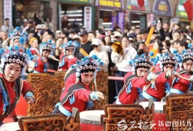 10月1日12時,新疆國際大巴扎步行街化身為一片沸騰的海洋,來自陜西神木的非物質(zhì)文化遺產(chǎn)代表性項目——“忠勇楊家鼓”在此激情上演,為八方來客獻上一場氣勢磅礴的傳統(tǒng)民俗盛宴。