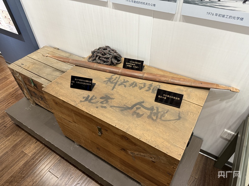 展柜中兩塊陳舊的紅色磚塊,銘刻著“史上最牛燒磚工”的故事?!爱敃r,為了能盡快恢復(fù)科研和教學(xué)工作,中國科大師生親手燒制了建造化學(xué)樓的紅磚,其中很多老師、學(xué)生如今已經(jīng)成長為教授甚至院士,所以我們也經(jīng)常戲稱這群燒磚工為‘史上最牛燒磚工’?!蓖趺A介紹。