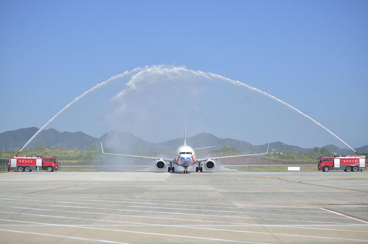 2025年9月28日,由中國國際航空?qǐng)?zhí)飛的北京大興至瑞金航班飛抵瑞金機(jī)場后通過“水門”。新華社發(fā)(楊鑫 攝)