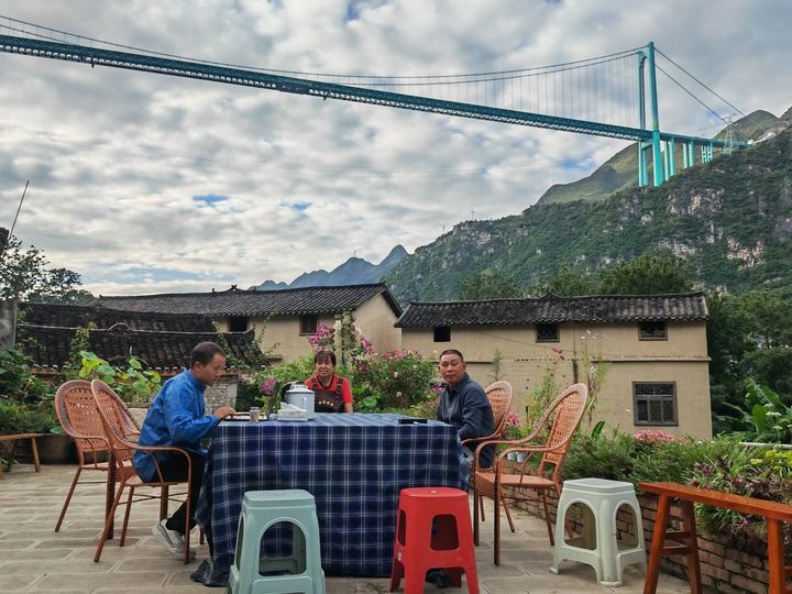 2025年9月27日,在貴州花江峽谷大橋附近,林國權(quán)(左)在自家民宿和員工坐在一起交流。新華社記者 向定杰 攝