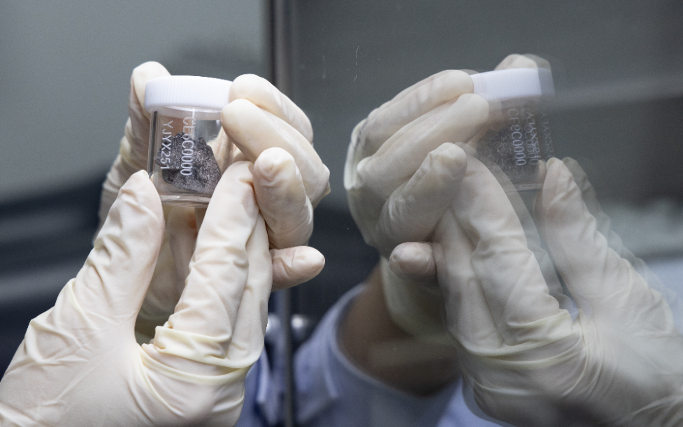 科研人員在月球樣品實驗室展示嫦娥六號月球樣品。新華社記者 金立旺 攝