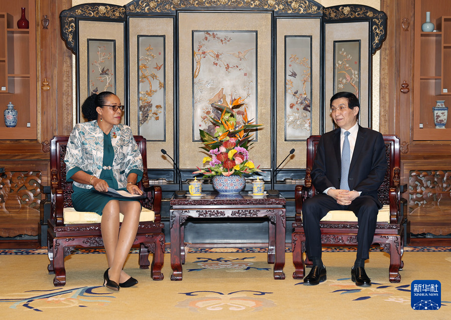 全國政協(xié)主席王滬寧14日在京會(huì)見來華出席全球婦女峰會(huì)的多米尼克總統(tǒng)伯頓。