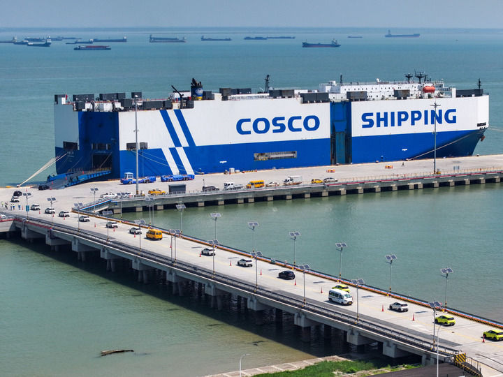 江蘇太倉港,“禮諾運(yùn)輸”號貨輪載著2600余輛汽車奔赴歐洲,“玉衡先鋒”號貨輪正將3600多輛國產(chǎn)新車運(yùn)往東南亞。