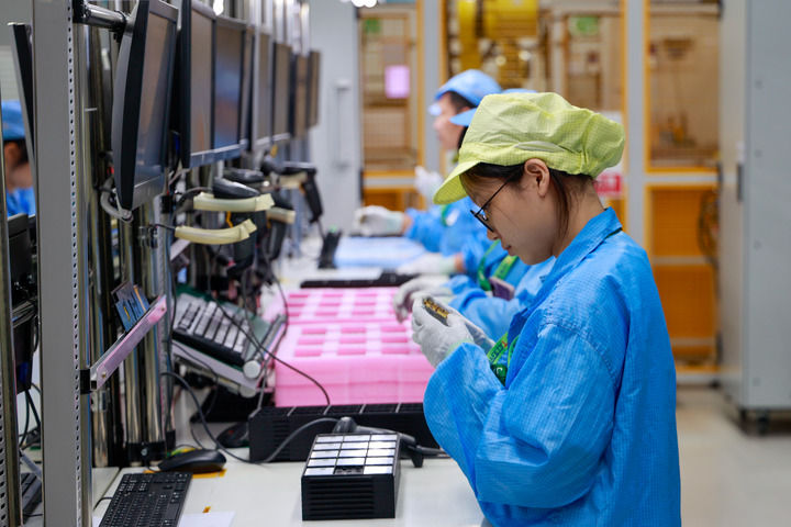 2025年9月15日,工作人員在江蘇無錫高新區(qū)綜合保稅區(qū)捷普電子(無錫)有限公司的生產(chǎn)車間里進(jìn)行產(chǎn)品檢驗(yàn)。新華社記者 劉佳琪 攝