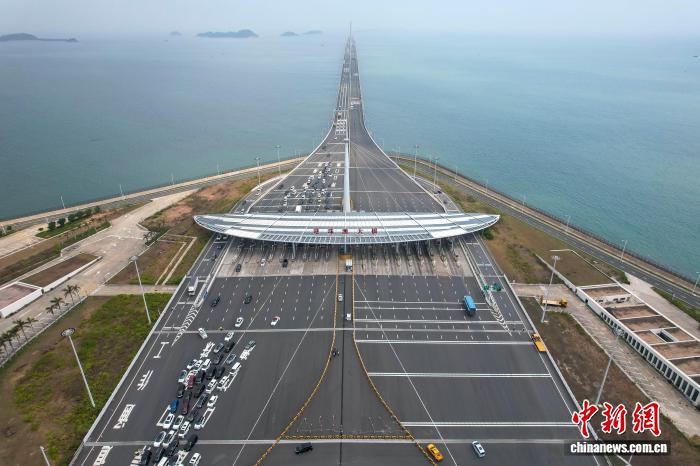 2024年3月30日,廣東珠海,港澳車輛經(jīng)港珠澳大橋珠海公路口岸入境。(無人機(jī)照片) 中新社記者 陳驥旻 攝