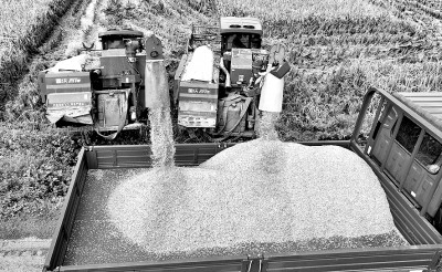 農(nóng)機在四川農(nóng)業(yè)大學(xué)科技示范點卸裝收獲的香稻。新華社發(fā)