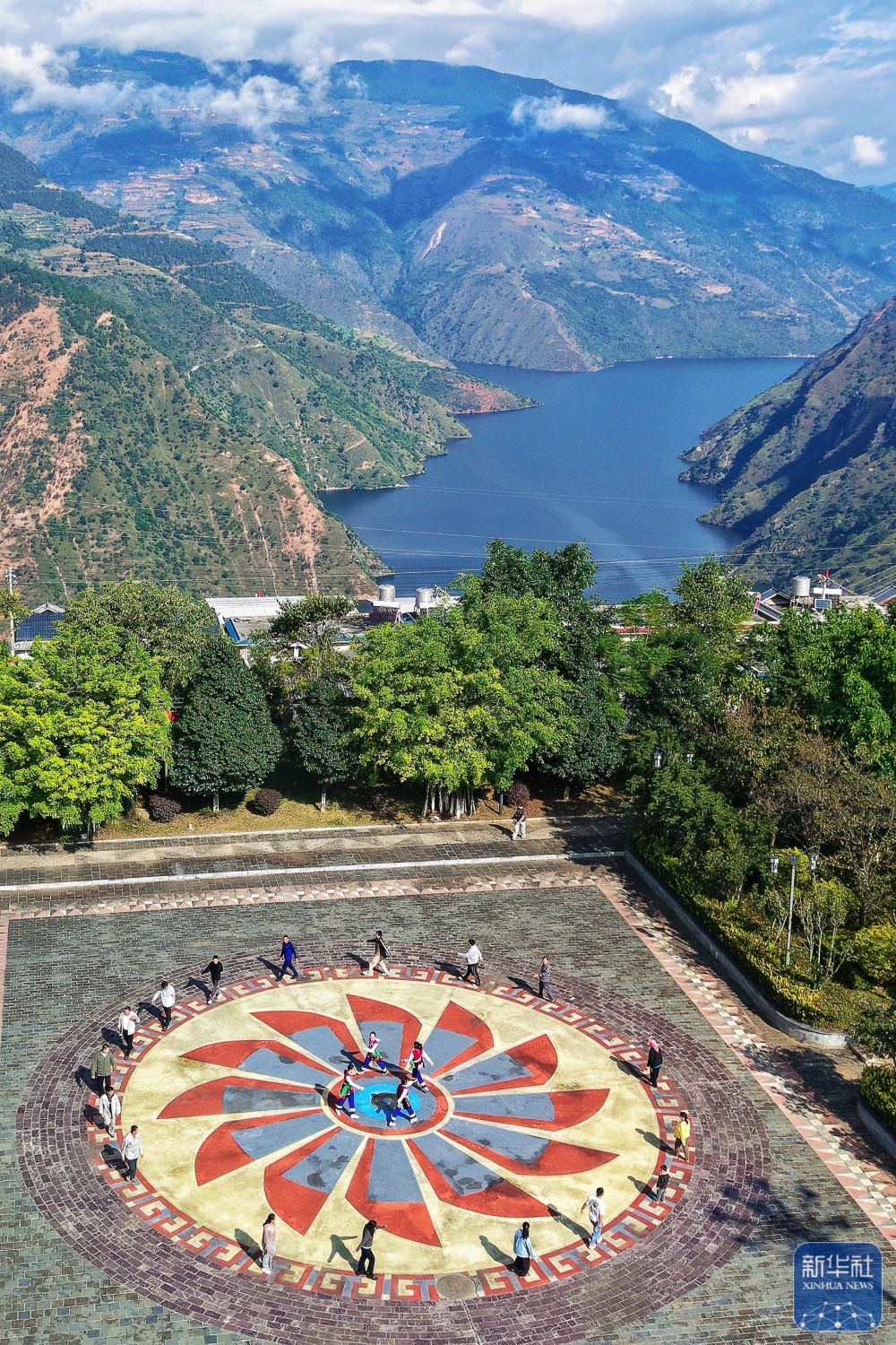 ↑ 10月31日,小灣東鎮(zhèn)居民在瀾滄江畔的移民廣場休閑(無人機(jī)照片)。