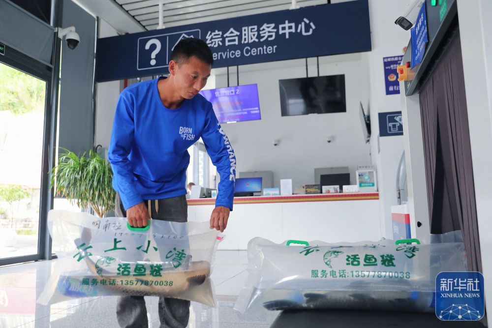 ↑ 10月31日,工作人員將裝袋、加氧后的小灣東鎮(zhèn)生態(tài)江魚放上安檢設(shè)備,準(zhǔn)備通過高鐵動車運往昆明。