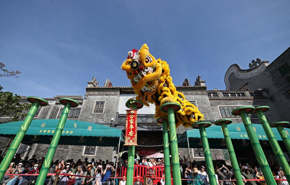 佛山黃飛鴻醒獅隊在黃飛鴻紀(jì)念館前表演。新華社記者 王鵬 攝