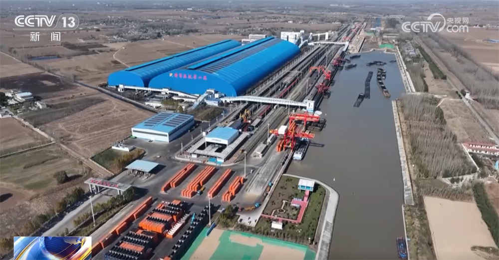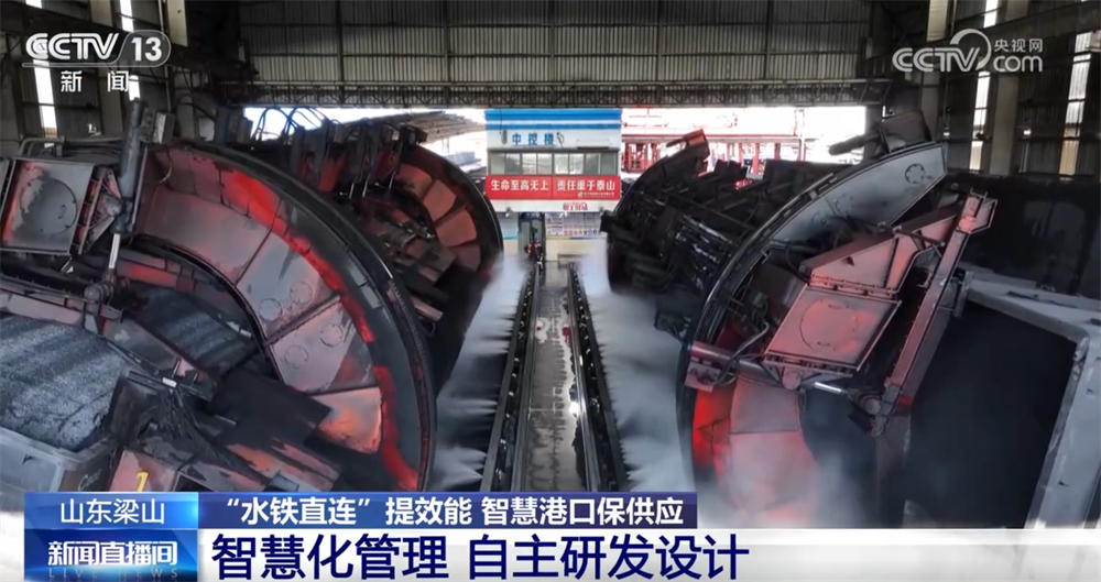 在現(xiàn)場,大家可以看到大型起重機正在往船上裝集裝箱,這是今年港口新推出的一種“水鐵直連”的煤炭運轉(zhuǎn)模式,就是把集裝箱的煤通過鐵路運到這里,不再經(jīng)過卸煤和存儲的過程,而是通過精準的需求調(diào)度把集裝箱直接裝船,通過運河發(fā)往目的地。這種方式大幅縮短了煤炭運輸?shù)闹芷?,把整個周期從5天縮短到3天,也提升了港口能源保障的效率和能力。