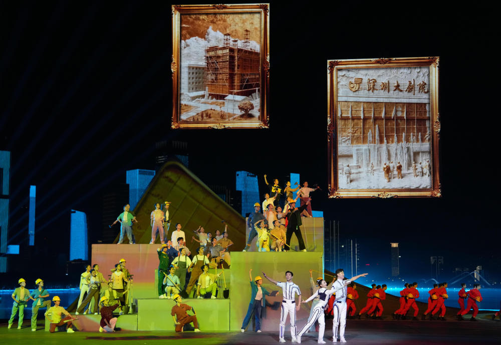 舞臺上,象征改革開放歷程的建設者們接力登場,劈山跨海,筑路架橋。他們帶著夢想南下,以敢闖敢試、敢為人先、埋頭苦干的特區(qū)精神,闖出一片新天地。
