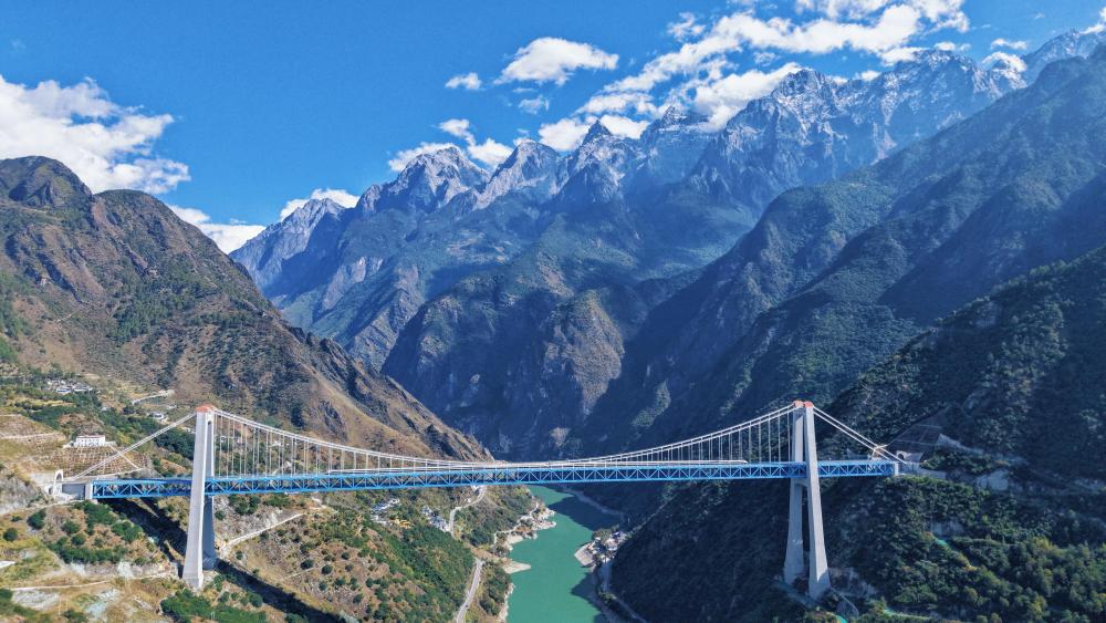 這是11月21日拍攝的虎跳峽金沙江鐵路大橋。大橋全長(zhǎng)882.5米,起于玉龍雪山隧道出口,止于哈巴雪山隧道進(jìn)口,是麗香鐵路的重點(diǎn)控制性工程(無(wú)人機(jī)照片)。
