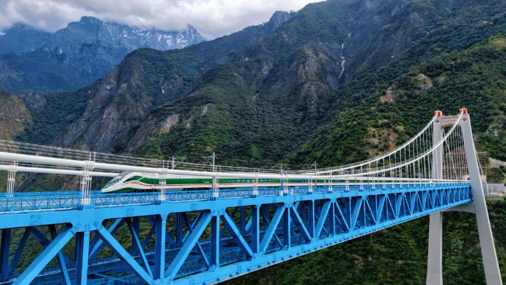 11月21日,動(dòng)車組列車通過虎跳峽金沙江鐵路大橋(無(wú)人機(jī)照片)。