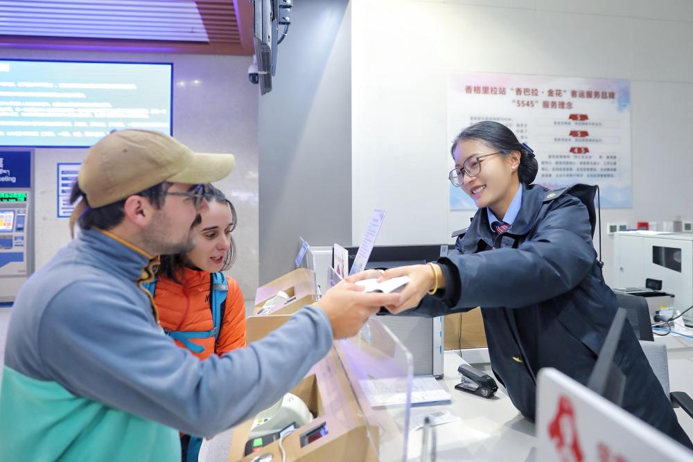 11月18日,外籍旅客在云南香格里拉站“香巴拉·金花”服務(wù)臺(tái)購(gòu)票。車站為旅客提供“一站式”出行服務(wù)。
