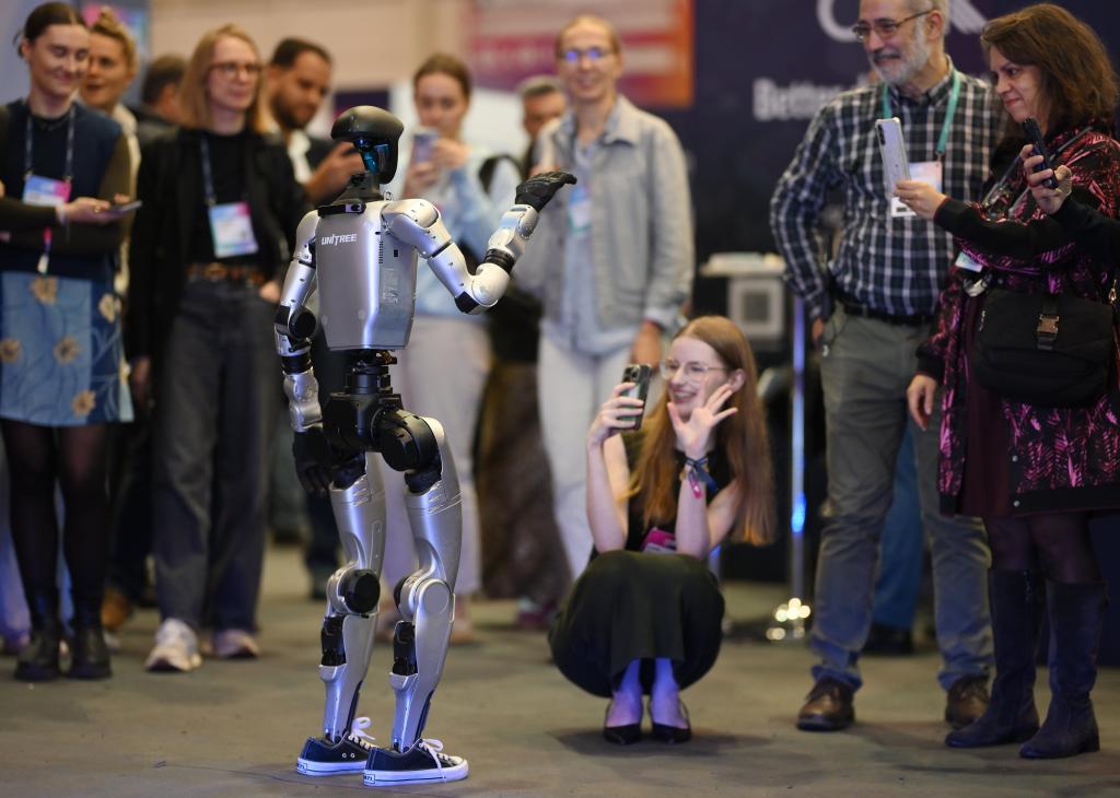 2025年11月12日,在葡萄牙里斯本,中國企業(yè)宇樹科技的人形機(jī)器人和與會(huì)者在2025年網(wǎng)絡(luò)峰會(huì)現(xiàn)場互動(dòng)。新華社發(fā)
