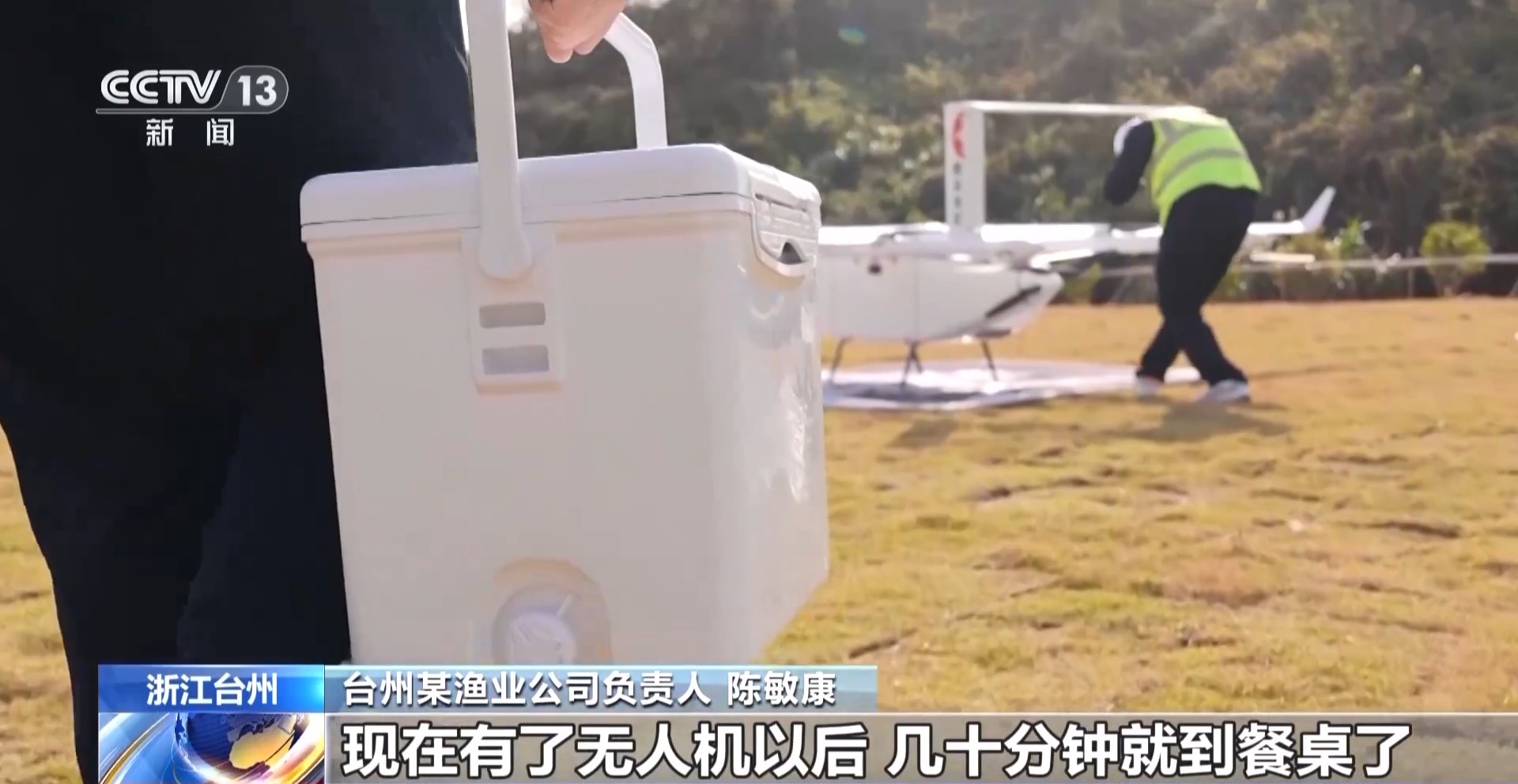臺州某漁業(yè)公司負責(zé)人 陳敏康:以前我們魚捕上去運到了市區(qū)都要好幾個小時,現(xiàn)在有了無人機以后,幾十分鐘就到餐桌了。現(xiàn)在無人機的運輸量比較小,但我們來看這個前景是比較好的,這也為我們島上的漁民開拓了致富的新路子。