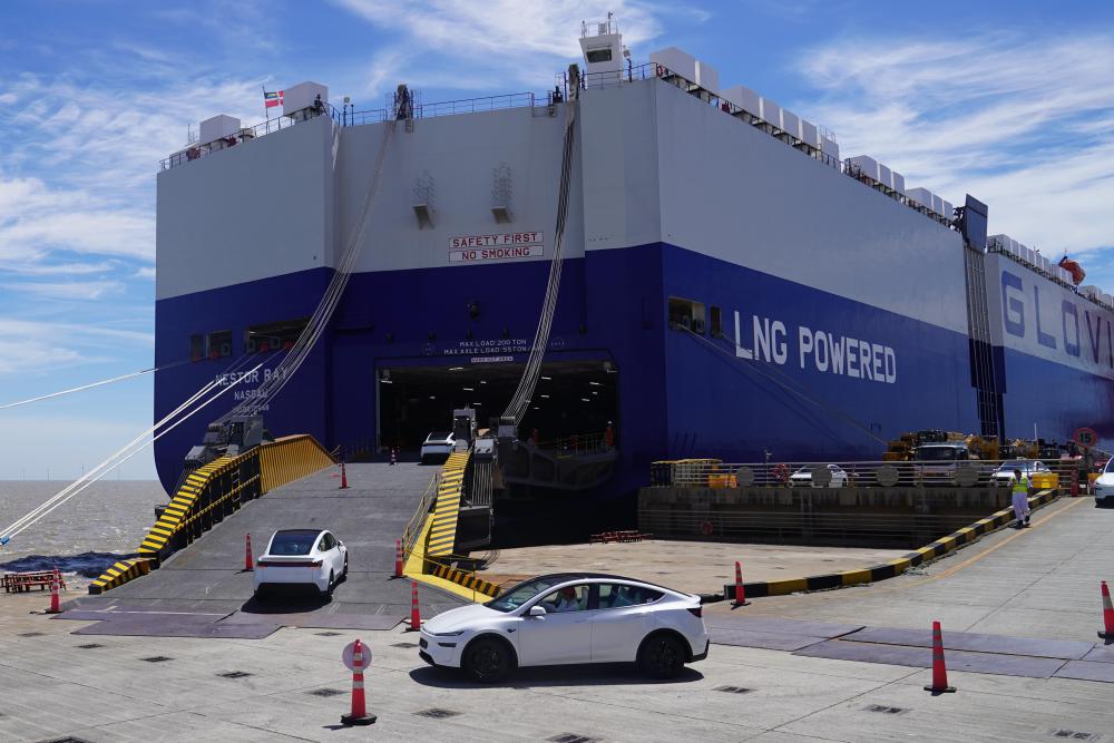 2025年7月2日,在上海自貿(mào)試驗(yàn)區(qū)臨港新片區(qū)南港碼頭,一批新能源汽車駛向一艘滾裝貨輪。新華社記者 楊有宗 攝
