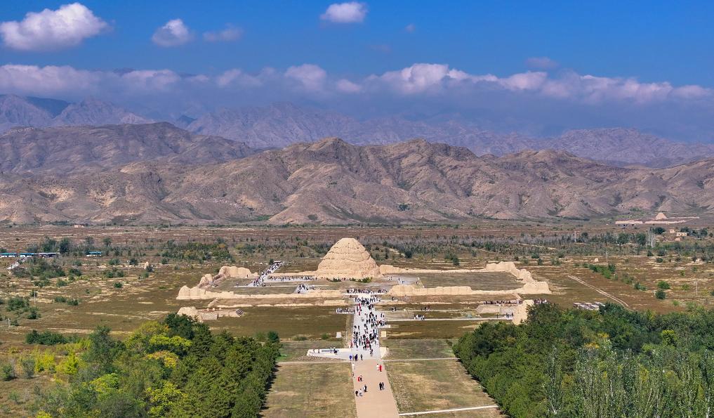 2025年10月2日,游客在西夏陵遺址區(qū)參觀三號(hào)陵(無(wú)人機(jī)照片)。新華社記者 馮開(kāi)華 攝