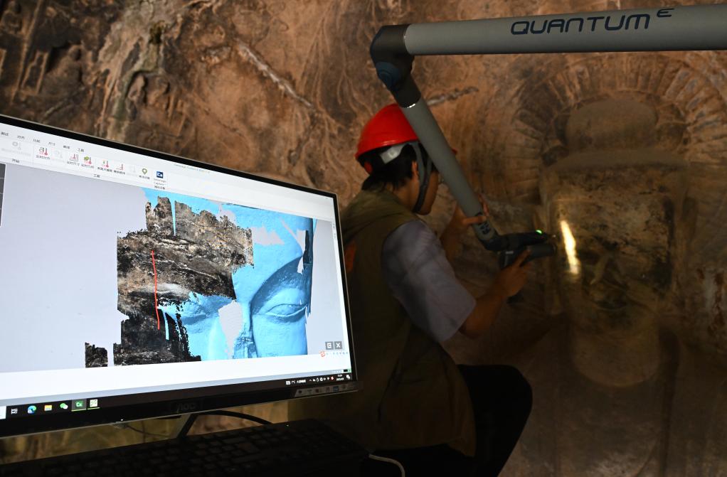 2025年4月9日,武漢大學(xué)文化遺產(chǎn)智能計(jì)算實(shí)驗(yàn)室團(tuán)隊(duì)成員在魏字洞使用關(guān)節(jié)臂掃描儀對(duì)佛像進(jìn)行數(shù)字化掃描。新華社記者 李嘉南 攝