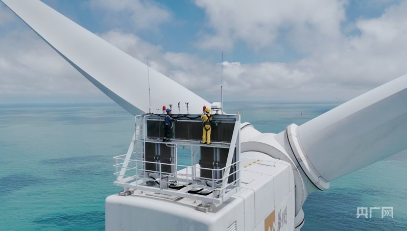 工作人員在風(fēng)機頂部開展檢修工作(央廣網(wǎng)發(fā) 受訪者供圖)