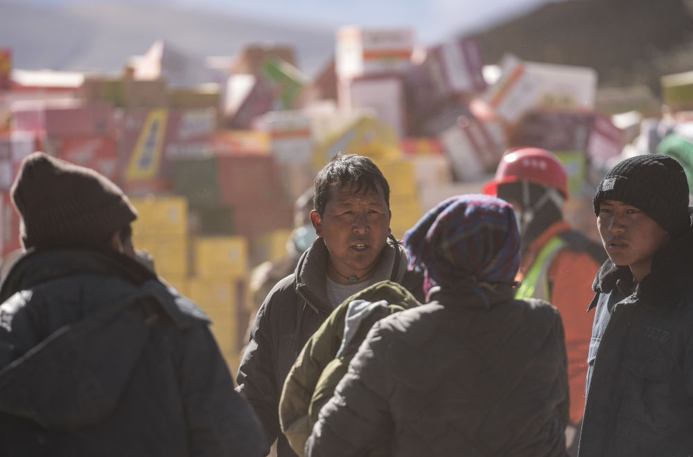 2025年1月10日,定日縣長(zhǎng)所鄉(xiāng)古榮村黨支部書(shū)記次仁平措(中)協(xié)助群眾搬進(jìn)板房。