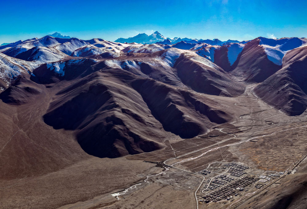 2025年11月12日拍攝的位于珠穆朗瑪峰腳下的定日縣措果鄉(xiāng)野江村(無(wú)人機(jī)照片)??拷榉宸较虻姆课轂榻ǔ刹⒔桓度罕娛褂玫男路俊?/p>