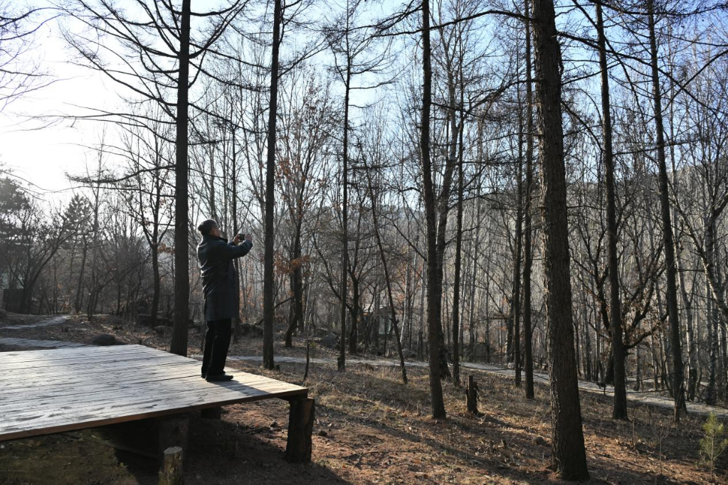 在離石大東溝森林旅游度假區(qū),張紅宇用手機記錄美景。新華網 發(fā)