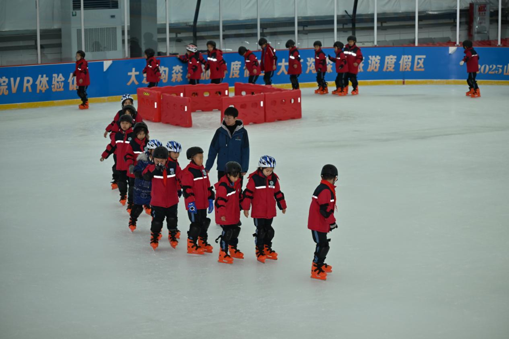 在王營莊文旅科創(chuàng)小鎮(zhèn)氣膜滑冰館,離石區(qū)一所小學的孩子們在體驗滑冰。新華網 發(fā)