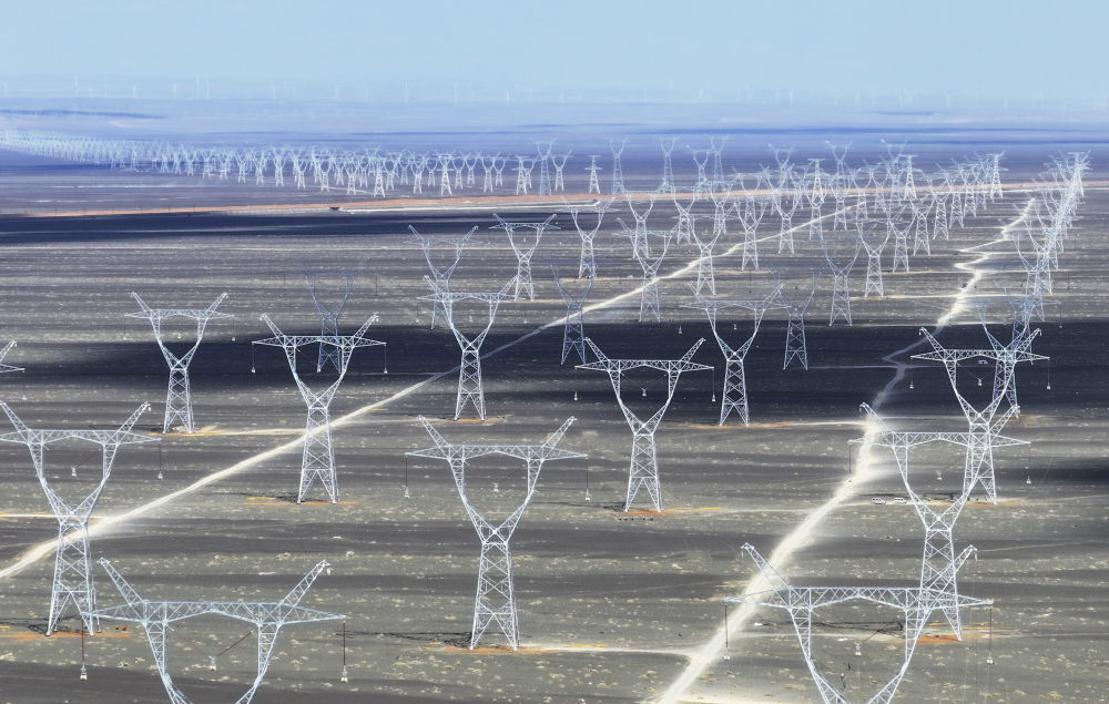 這是2025年4月24日在新疆哈密地區(qū)三塘湖鎮(zhèn)附近拍攝的“疆電入渝”特高壓工程(無人機照片)。新華社記者 王菲 攝