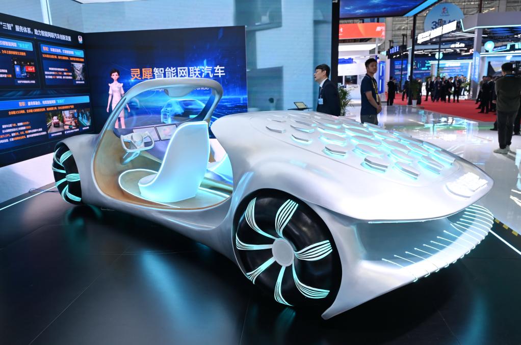 2025年4月29日,在第八屆數(shù)字中國建設(shè)峰會現(xiàn)場體驗(yàn)區(qū)拍攝的靈犀智能網(wǎng)聯(lián)汽車。新華社記者 林善傳 攝