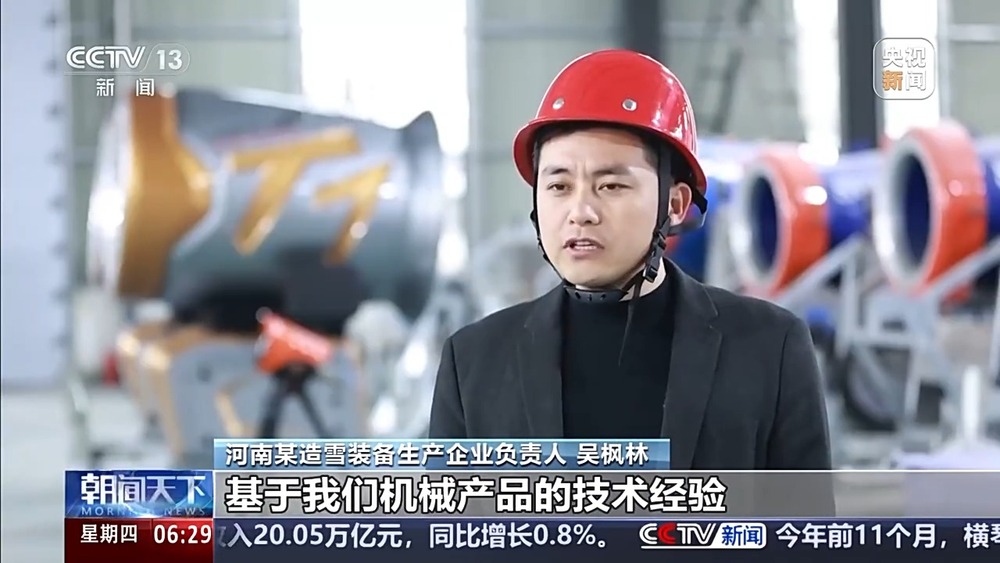 總臺(tái)央視記者 杜思源:冰雪產(chǎn)業(yè),從造雪制冰開始,到滑雪場(chǎng)的纜車、壓雪車等設(shè)施,再到我們使用的雪服雪板等等,涉及的門類繁多。推動(dòng)冰雪經(jīng)濟(jì)高質(zhì)量發(fā)展,不同產(chǎn)線的協(xié)作、區(qū)域間的高效協(xié)同,至關(guān)重要。我現(xiàn)在是在河北崇禮的一家滑雪場(chǎng),距離這里一個(gè)小時(shí)車程,就是當(dāng)?shù)氐谋┊a(chǎn)業(yè)園。在京津冀地區(qū)的多個(gè)雪場(chǎng),都有來自這座產(chǎn)業(yè)園的冰雪裝備。
