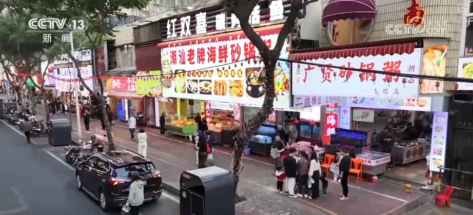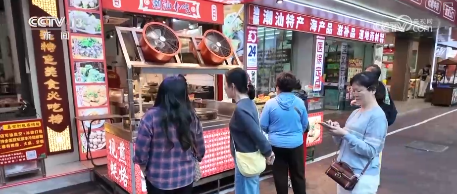 第一站來到汕頭著名的美食集聚地龍眼南路美食街,這里全長470米,涵蓋潮汕特色美食、茶飲甜品、創(chuàng)意餐飲等。游客不僅可以吃上腸粉、粿條湯等傳統(tǒng)早餐,還能品嘗鹵鵝、生腌等招牌菜肴,以及反沙芋頭、腐乳雞翅等特色小吃。這條24小時(shí)不打烊的美食街吸引了來自全國各地的游客。