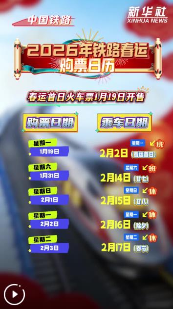 記者1月18日從中國國家鐵路集團(tuán)有限公司獲悉,2026年鐵路春運(yùn)自2月2日開始,至3月13日結(jié)束,為期40天,全國鐵路預(yù)計(jì)發(fā)送旅客5.39億人次,節(jié)前客流高峰日預(yù)計(jì)為2月13日(臘月廿六),節(jié)后客流高峰日預(yù)計(jì)為2月23日(正月初七),春運(yùn)首日火車票將于1月19日開始發(fā)售。