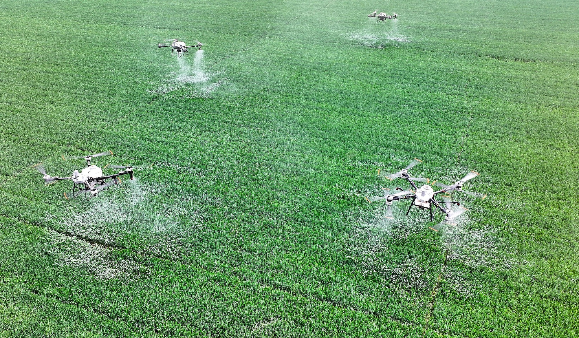 2025年4月9日,安徽省亳州市利辛縣永興鎮(zhèn)諸王社區(qū),種糧大戶(hù)利用植保無(wú)人機(jī)給小麥噴灑藥物。