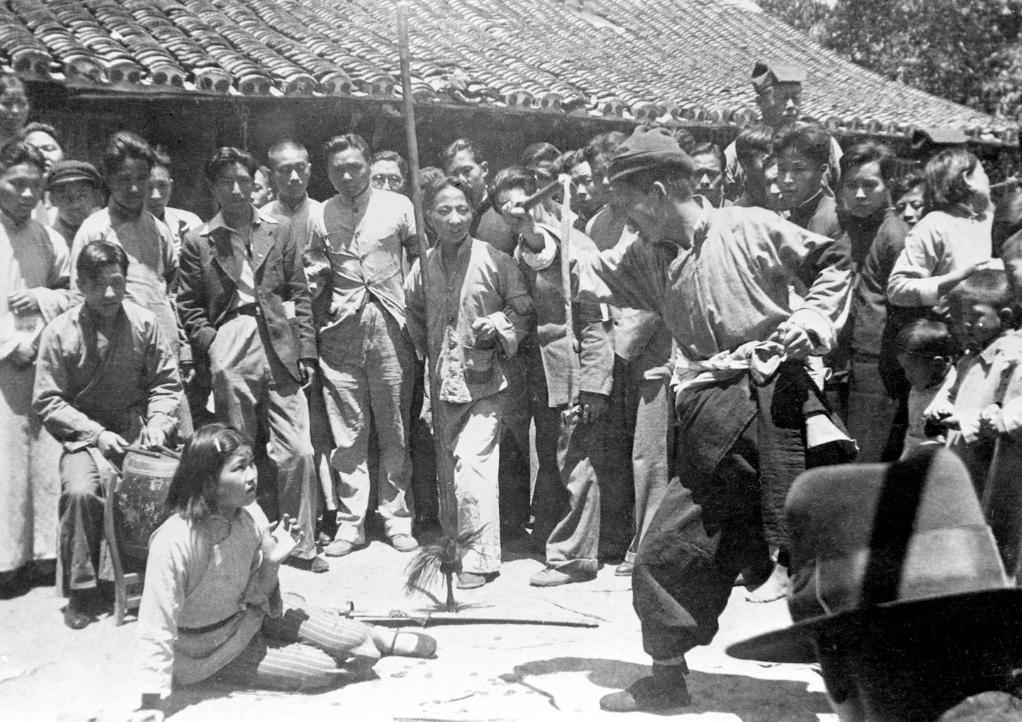 在國民黨統(tǒng)治區(qū),進(jìn)步的文藝團(tuán)體到農(nóng)村演出抗戰(zhàn)話劇《放下你的鞭子》。該劇是“國防戲劇”代表作。(新華社發(fā))