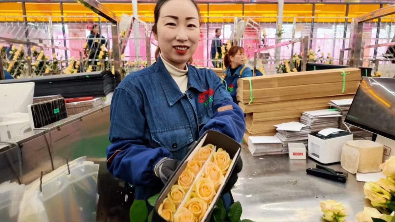 經(jīng)她們之手,高原玫瑰通過冷鏈物流,走向全國各地乃至海外。這讓張婷婷格外自豪:“我包的花有一天竟然能到國外。他們捧著它的時候,會是什么心情?會不會很開心?”