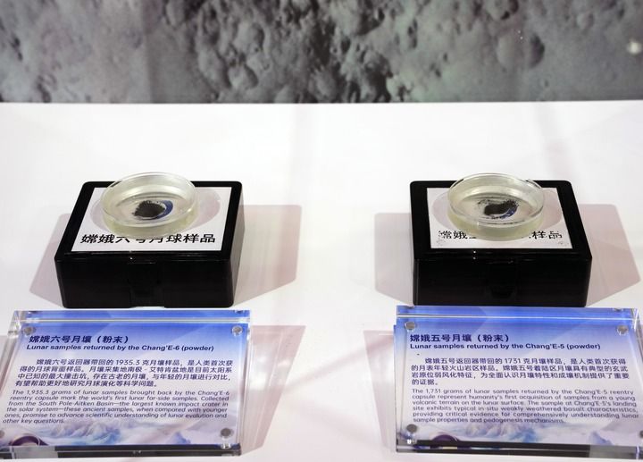 2025年11月5日在第八屆進(jìn)博會(huì)國家展中國館拍攝的“嫦娥五號(hào)”月壤和“嫦娥六號(hào)”月壤。