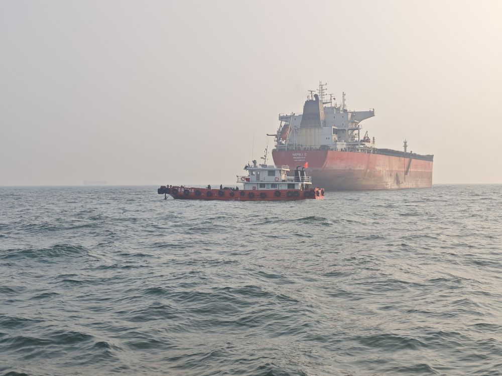“看,那艘船在干什么,會(huì)不會(huì)是非法搭靠?”記者發(fā)出疑問。不遠(yuǎn)處,一艘小船正停在貨輪旁邊。