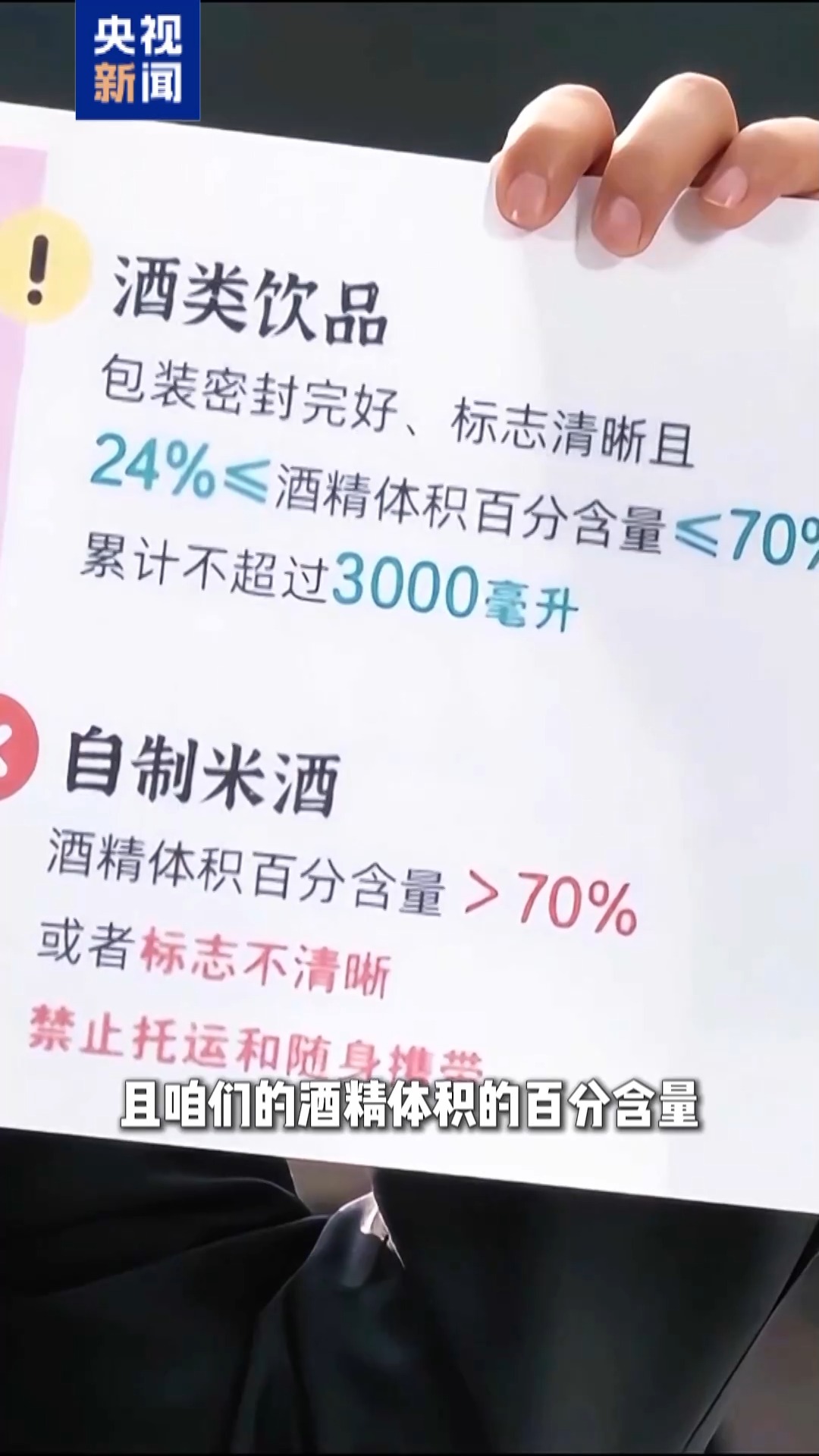 國鐵沈陽局長春客運(yùn)段列車長 劉影:酒能帶,但是有幾個前提,首先包裝要完好,而且標(biāo)志清晰,酒精體積的百分含量在24%和70%之間,總攜帶量不要超過3000毫升。