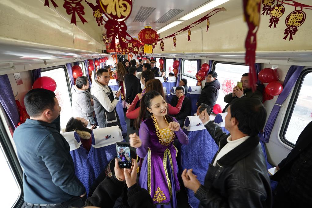 各族群眾在列車“巴扎”上載歌載舞。新華社記者白志強(qiáng)攝
