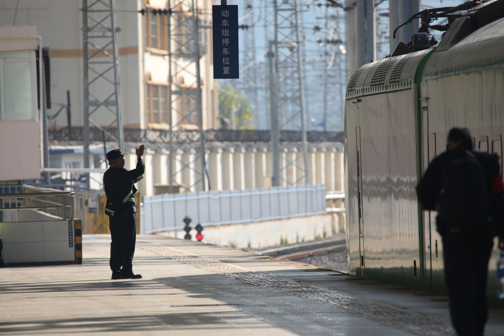 ↑ 2月16日,在昆明站,中鐵昆明局集團(tuán)的職工進(jìn)行發(fā)車前的例行檢查。新華社發(fā)(李云生攝)