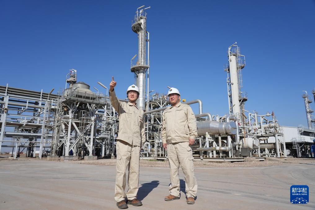 2月16日,在伊拉克瓦西特省,中國(guó)綠洲石油公司計(jì)劃部副經(jīng)理劉學(xué)(左)在艾哈代布油田中心處理站巡檢。新華社記者 段敏夫 攝