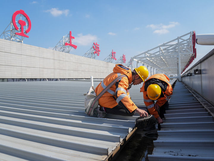2月17日,中國(guó)鐵路上海局集團(tuán)有限公司上海房建公寓段的工作人員在上海虹橋火車(chē)站的屋面鋼結(jié)構(gòu)上清理垃圾。新華社記者 丁汀 攝