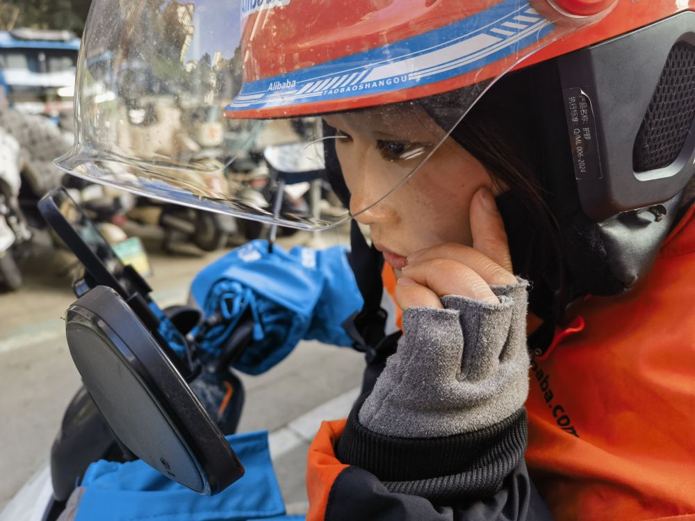 外賣騎手朱亭亭在查看雨雪天氣送餐時臉上摔出的傷。新華社記者 朱青 攝