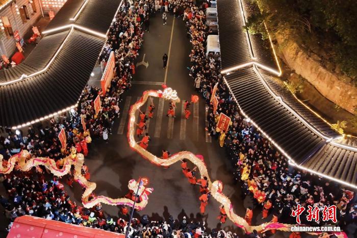 巡游隊伍沿著主街緩緩前行。龍身時而盤旋、時而騰躍,鑼鼓節(jié)奏忽快忽慢,舞龍者不斷變換步法。許多人圍在路邊,孩子們追著龍尾一路小跑。