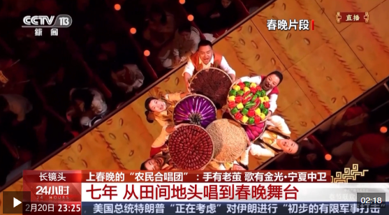 除夕夜,寧夏中衛(wèi)市中寧縣大戰(zhàn)場(chǎng)鎮(zhèn)農(nóng)民合唱團(tuán)登上央視春晚舞臺(tái),與廖昌永、鳳凰傳奇等知名歌手同臺(tái),用最質(zhì)樸的嗓音,唱出《來(lái)曬秋》的豐收喜悅。