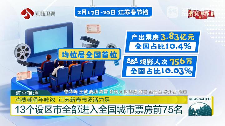 電影票房是文化消費活力的風向標。截至目前,全國春節(jié)檔電影總票房已突破40億元。作為全國票倉,江蘇電影市場持續(xù)領跑全國:2月17日至20日,江蘇產出票房超3.83億元,全國占比10.4%;觀影人次超756萬,全國占比10.03%,票房和人次均位居全國首位。放眼全國,江蘇展現(xiàn)出“萬馬奔騰”的票房趨勢,13個設區(qū)市全部進入全國城市票房前75名,蘇州、南京、南通、無錫、鹽城五市進入全國前20名。
