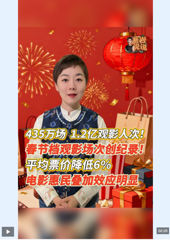 2026馬年春節(jié)檔圓滿收官,精彩表現(xiàn)彰顯了文化惠民實(shí)效與市場(chǎng)的強(qiáng)勁活力。從充足供給、親民票價(jià)到下沉市場(chǎng)發(fā)力,電影產(chǎn)業(yè)以惠民政策為抓手,聯(lián)動(dòng)多方釋放消費(fèi)潛力,帶動(dòng)多元業(yè)態(tài)融合發(fā)展。中國(guó)電影穩(wěn)步邁向高質(zhì)量發(fā)展,持續(xù)為群眾美好生活添彩,為文化繁榮與經(jīng)濟(jì)增長(zhǎng)注入新動(dòng)能。
