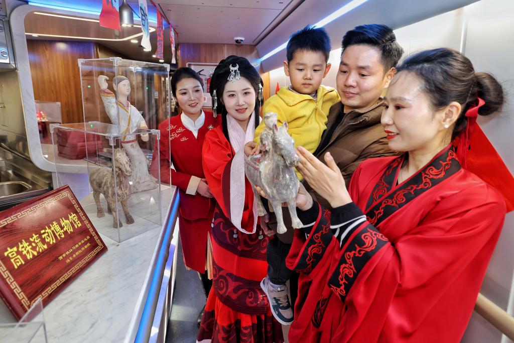 2月11日,西安北開往香港西九龍的G916次陜港高鐵列車上,身著漢服的工作人員向旅客展示漢代馬形文物復(fù)制品,并講解相關(guān)歷史文化。(國鐵西安局集團(tuán)公司供圖)