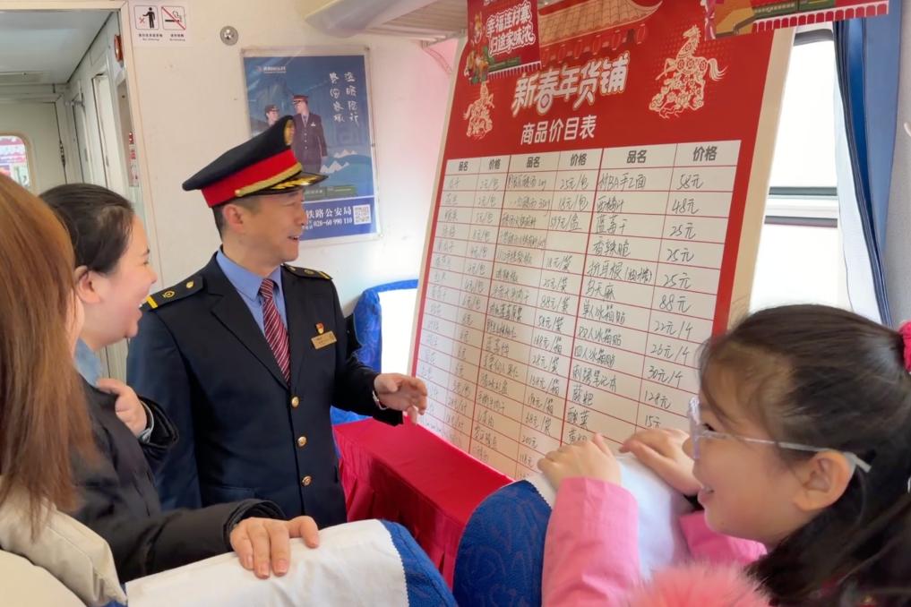 5640次列車列車長胡貴川向旅客介紹年貨價(jià)格。(國鐵成都局集團(tuán)公司貴陽客運(yùn)段供圖)